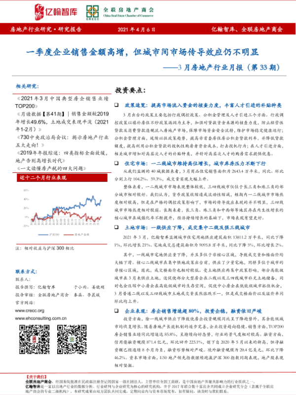 【亿翰智库】【20210406】一季度企业销售金额高增,但城市间市场传导效应仍不明显-29页