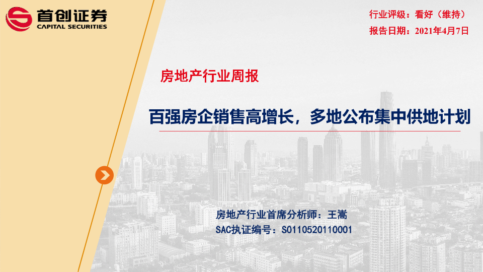 【首创证券】【20210407】房地产行业周报:百强房企销售高增长,多地公布集中供地计划-26页