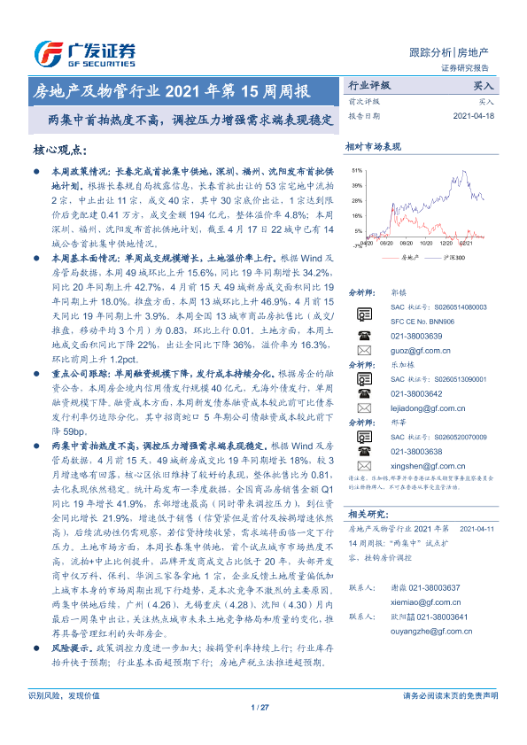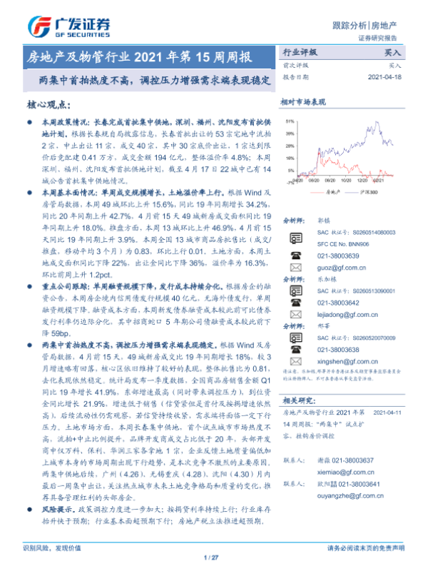 【广发证券】【20210418】房地产及物管行业2021年第15周周报:两集中首拍热度不高,调控压力增强需求端表现稳定-27页
