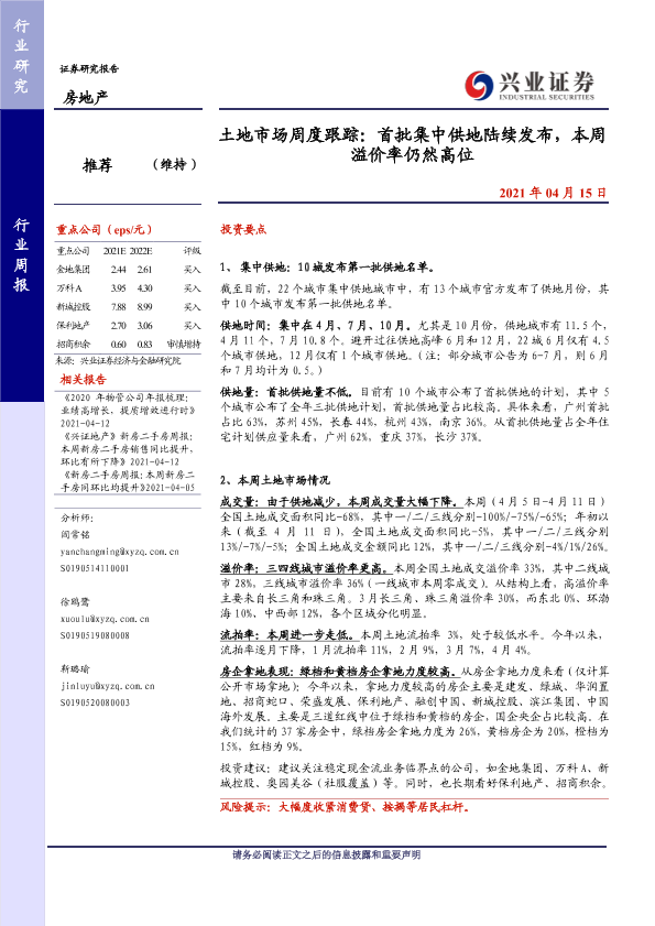 【兴业证券】【20210415】土地市场周度跟踪:首批集中供地陆续发布,本周溢价率仍然高位-12页