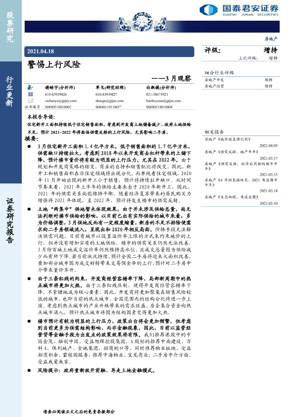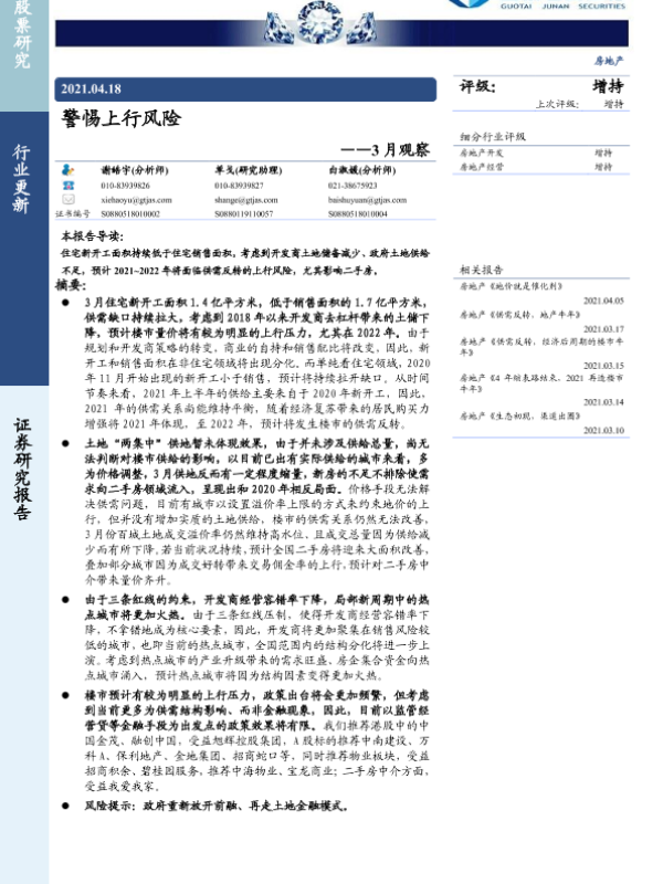 【国泰君安证券】【20210418】房地产3月观察:警惕上行风险-3页
