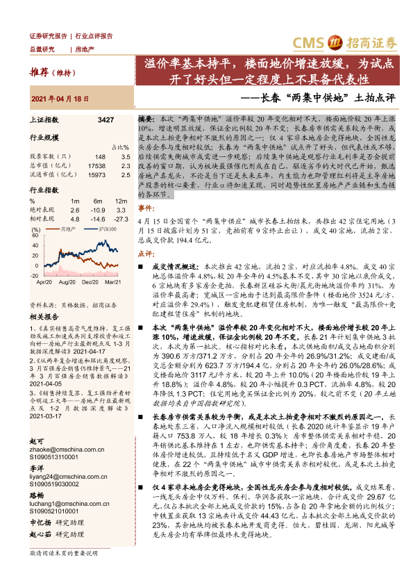 【海通证券】【20210418】长春“两集中供地”土拍点评:溢价率基本持平,楼面地价增速放缓,为试点开了好头但一定程度上不具备代表性-3页