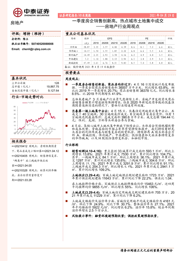 【中泰证券】【20210419】房地产行业周观点:一季度房企销售创新高,热点城市土地集中成交-13页