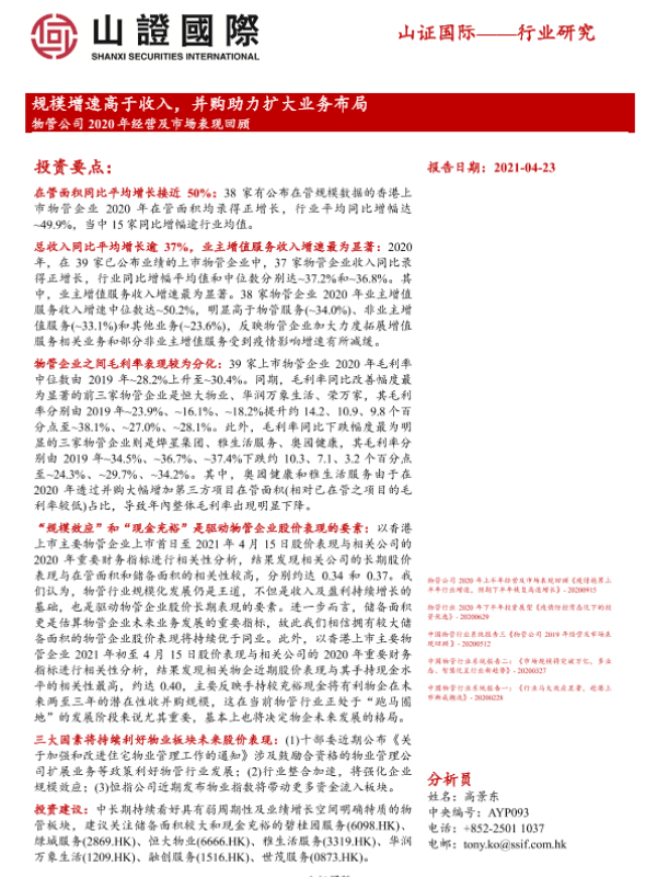 【山证国际证券】【20210423】物管公司2020年经营及市场表现回顾:规模增速高于收入,并购助力扩大业务布局-32页