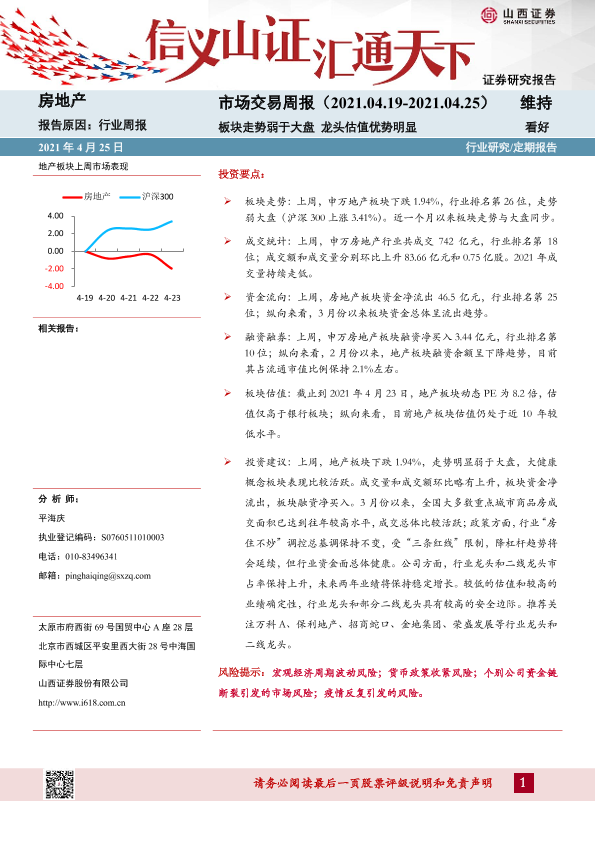 【山西证券】【20210425】房地产市场交易周报:板块走势弱于大盘 龙头估值优势明显-20页