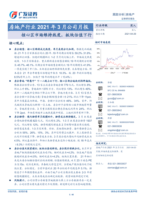 【广发证券】【20210429】房地产行业2021年3月公司月报:核心区市场维持热度,板块估值下行-41页