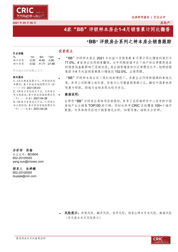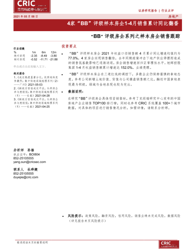 【克而瑞证券】【20210508】4家“BB”评级样本房企1-4月销售累计同比翻番-4页