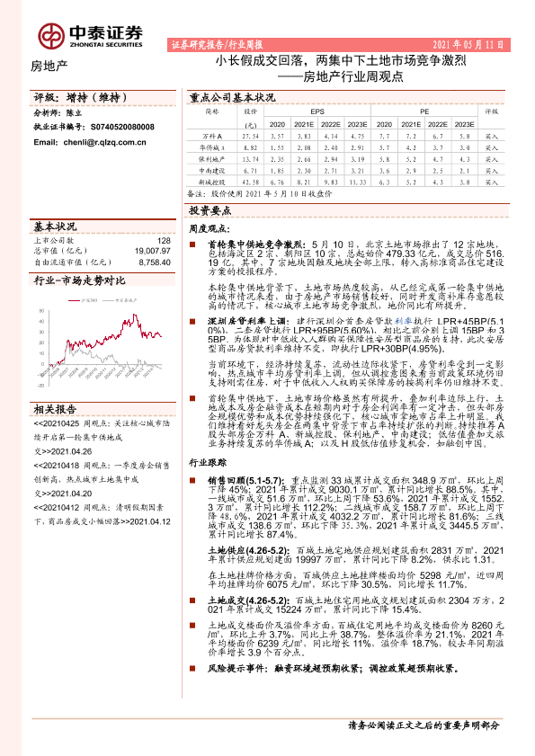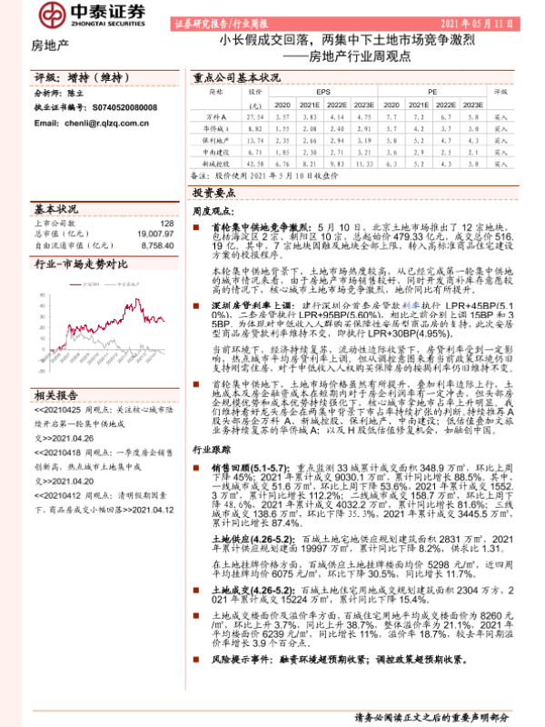 【中泰证券】【20210511】小长假成交回落,两集中下土地市场竞争激烈-13页