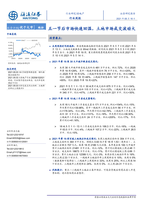 【海通证券】【20210516】房地产行业周报:五一节后市场快速回温,土地市场成交波动大-6页