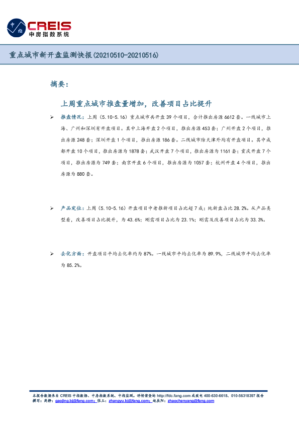城市房产 房地产市场 房源去化率 改善项目 新开盘监测