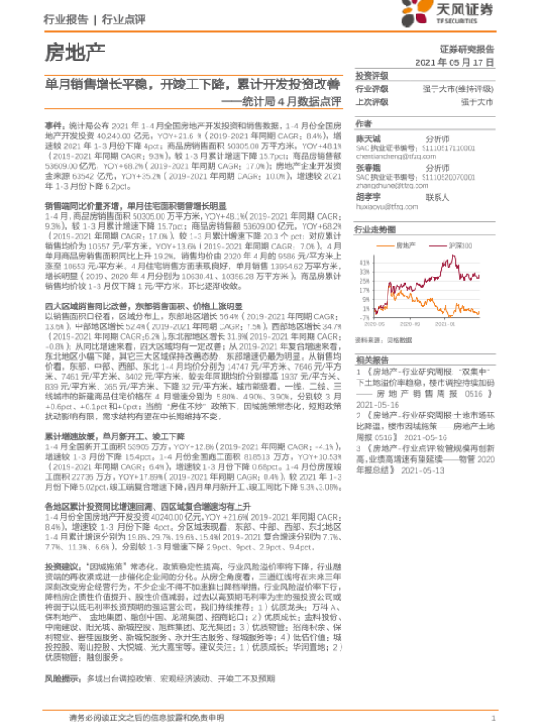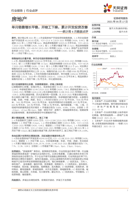 【天风证券】【20210517】单月销售增长平稳,开竣工下降,累计开发投资改善-2页