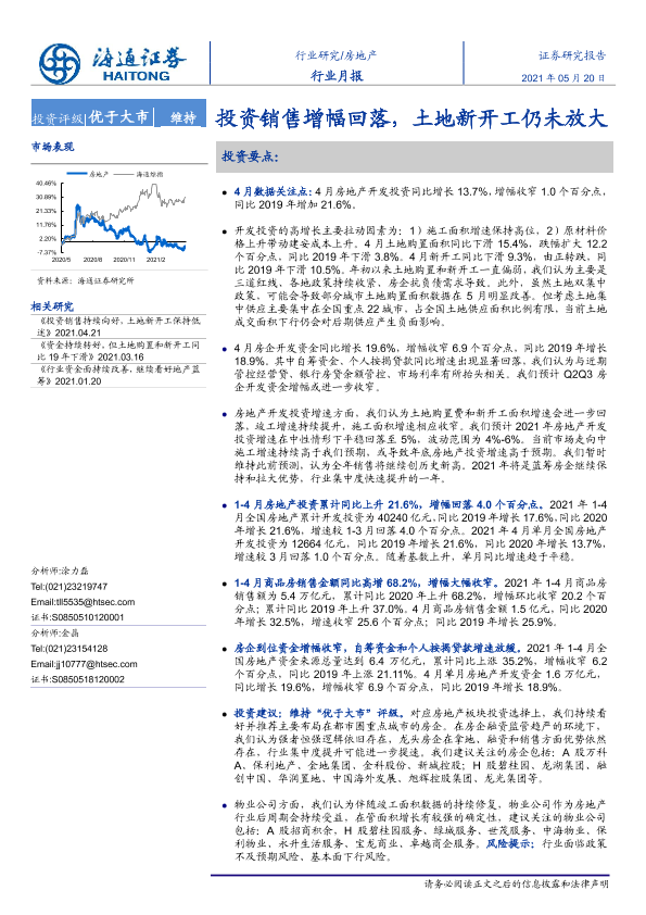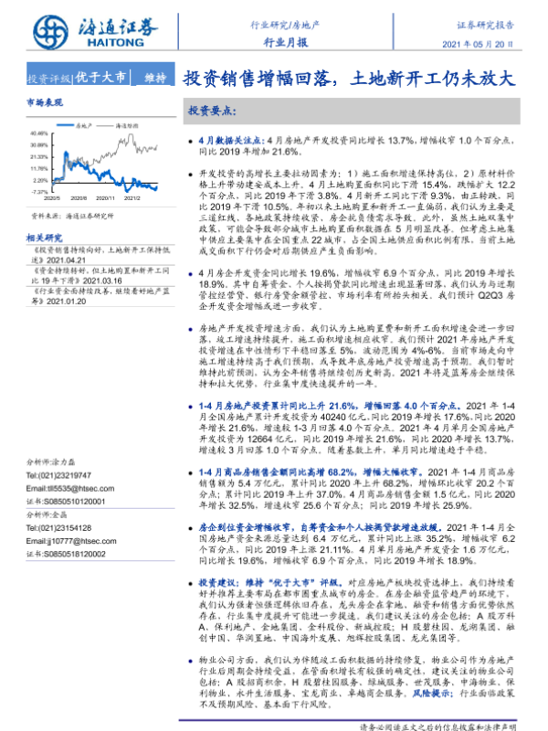 【海通证券】【20210520】房地产行业月报:投资销售增幅回落,土地新开工仍未放大-12页