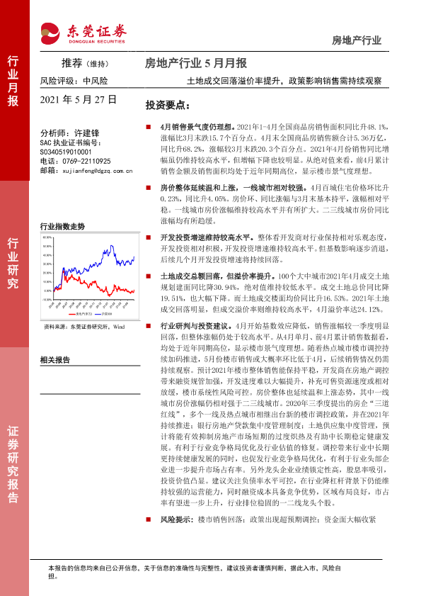 【东莞证券】【20210527】房地产行业5月月报:土地成交回落溢价率提升,政策影响销售需持续观察-14页