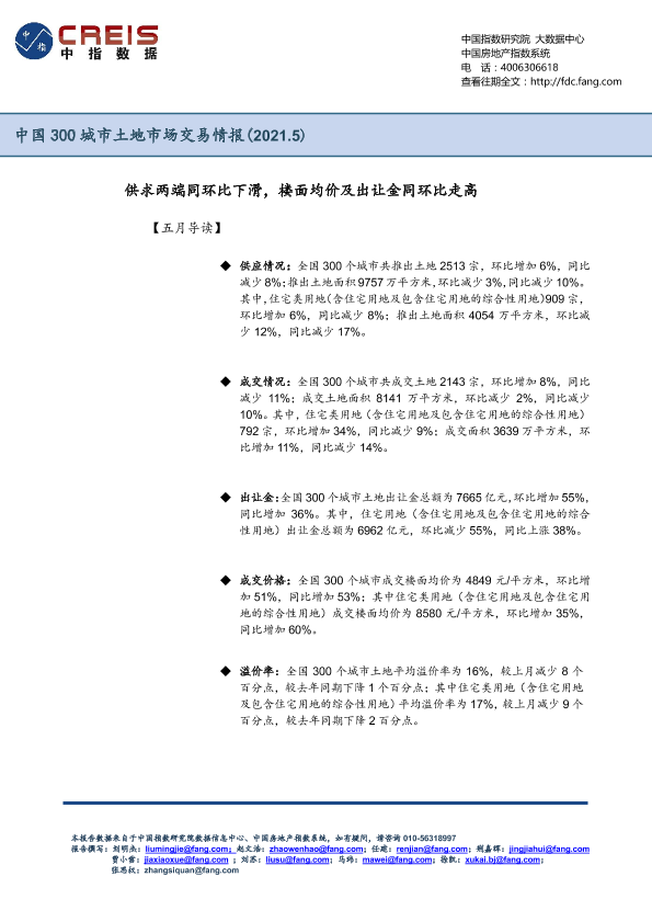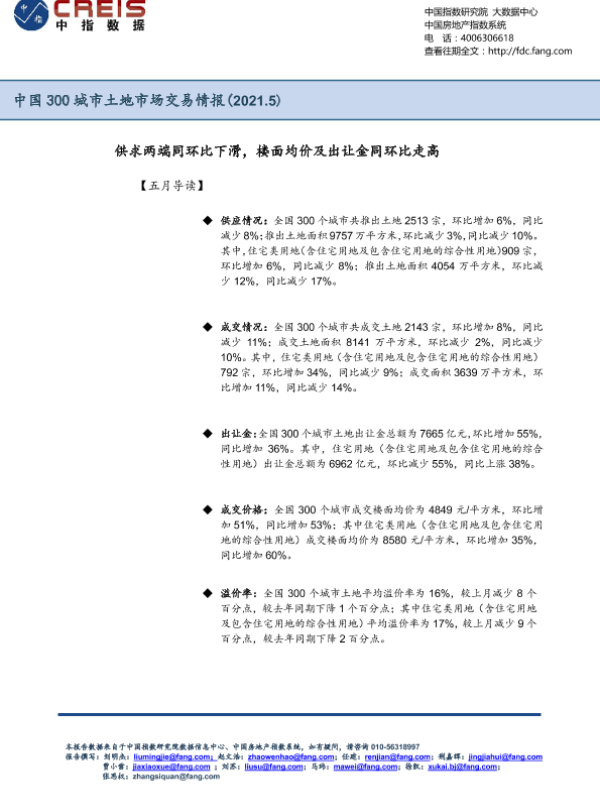 【中指研究院】【20210531】中国300城市土地市场交易情报:供求两端同环比下滑,楼面均价及出让金同环比走高-12页