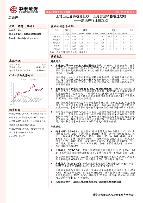 【中泰证券】【20210607】土地出让金转税务征收,五月房企销售增速放缓-12页