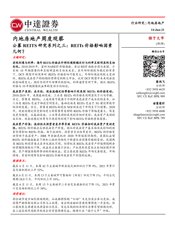【中达证券】【20210614】内地房地产周度观察:公募REITS研究系列之三:REITs价格影响因素几何?-19页