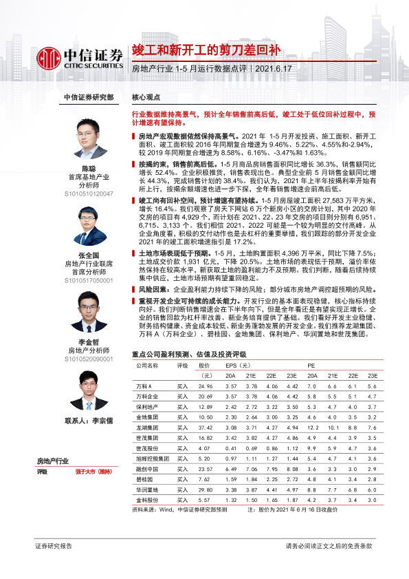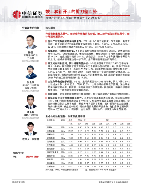 【中信证券】【20210617】房地产行业1-5月运行数据点评:竣工和新开工的剪刀差回补-9页
