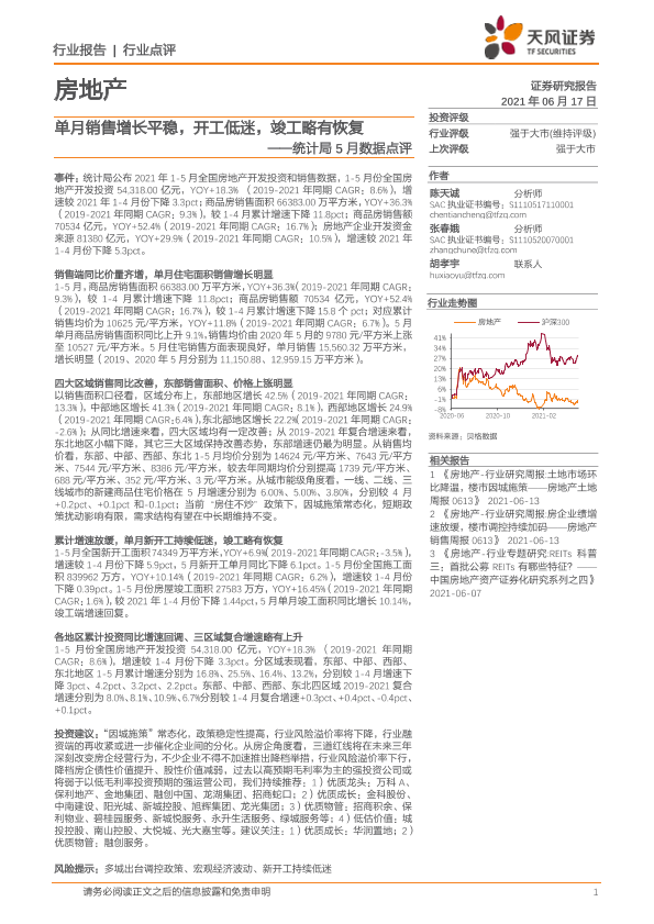 【天风证券】【20210617】单月销售增长平稳,开工低迷,竣工略有恢复-2页