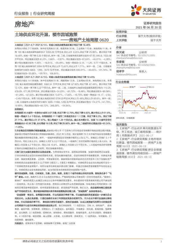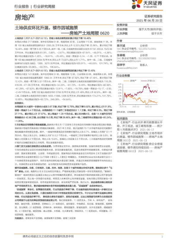 【天风证券】【20210620】房地产土地周报:土地供应环比升温,楼市因城施策-9页