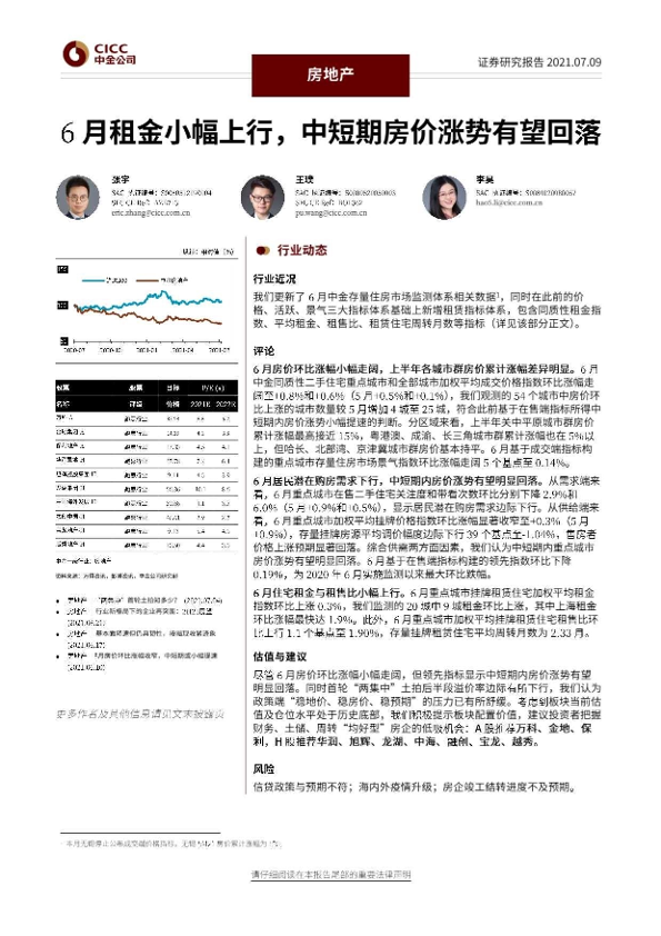 【中金公司】【20210709】6月租金小幅上升,中短期房价涨势有望回落-20页