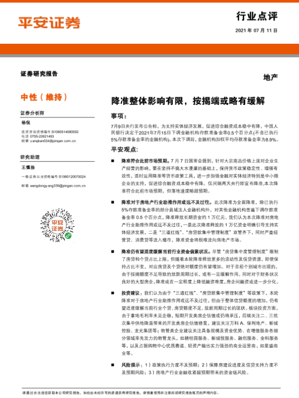 【平安证券】【20210711】地产行业点评:降准整体影响有限,按揭端或略有缓解-2页