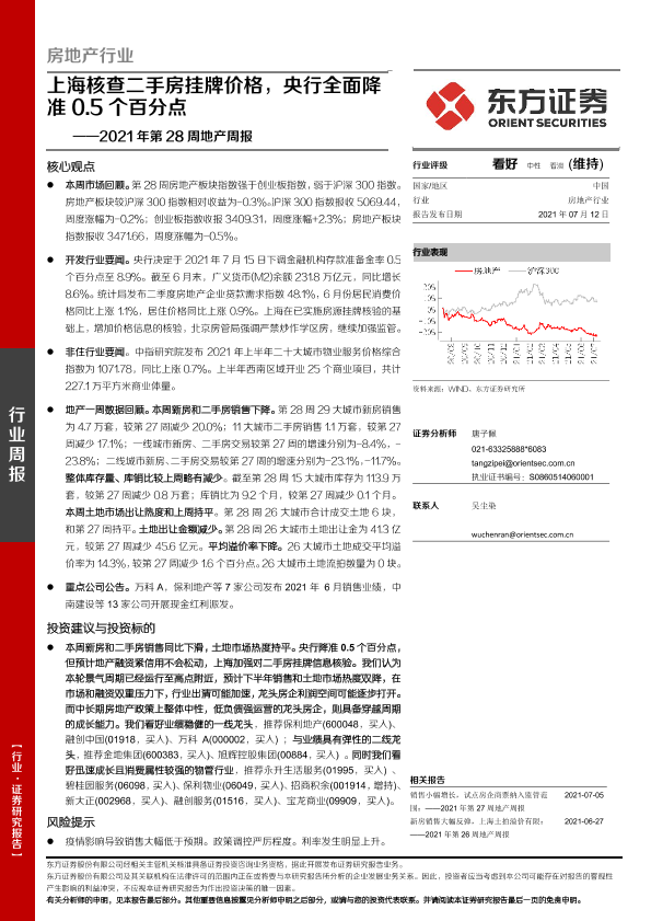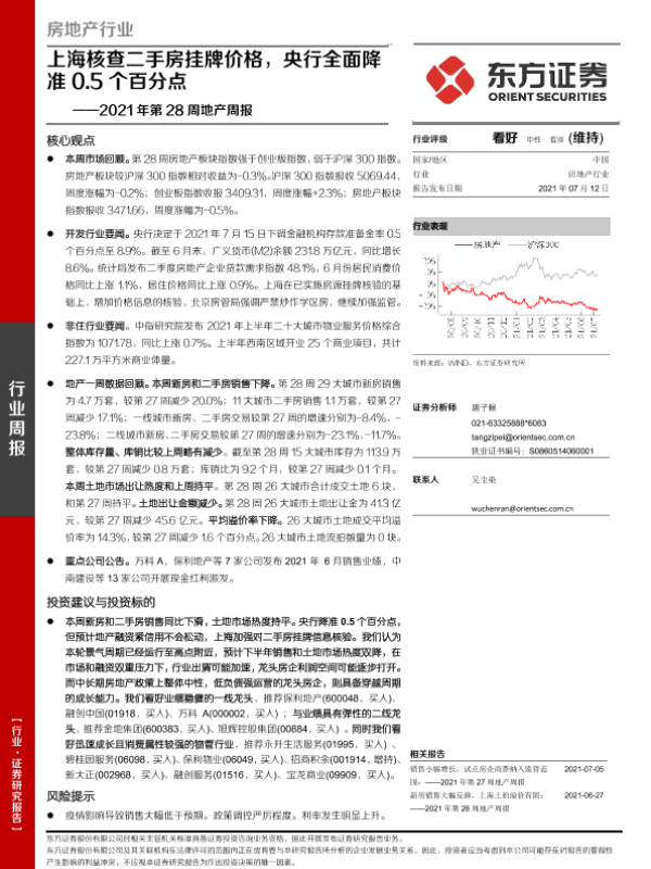 【东方证券】【20210712】2021年第28周地产周报:上海核查二手房挂牌价格,央行全面降准0.5个百分点-18页