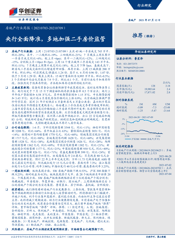【华创证券】【20210712】房地产行业周报:央行全面降准,多地加强二手房价监管-16页