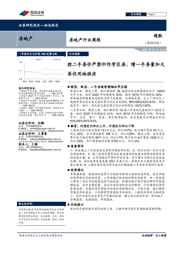 【国信证券】【20210713】房地产行业周报:控二手房价严禁炒作学区房,增一手房量加大居住用地供应-9页