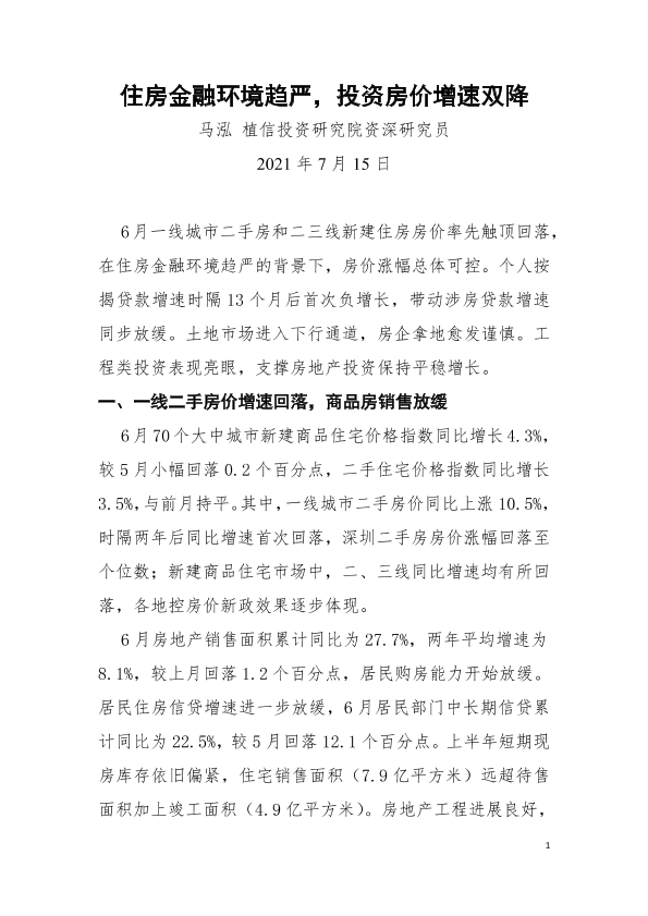 【植信投资研究院】【20210715】住房金融环境趋严,投资房价增速双降-5页