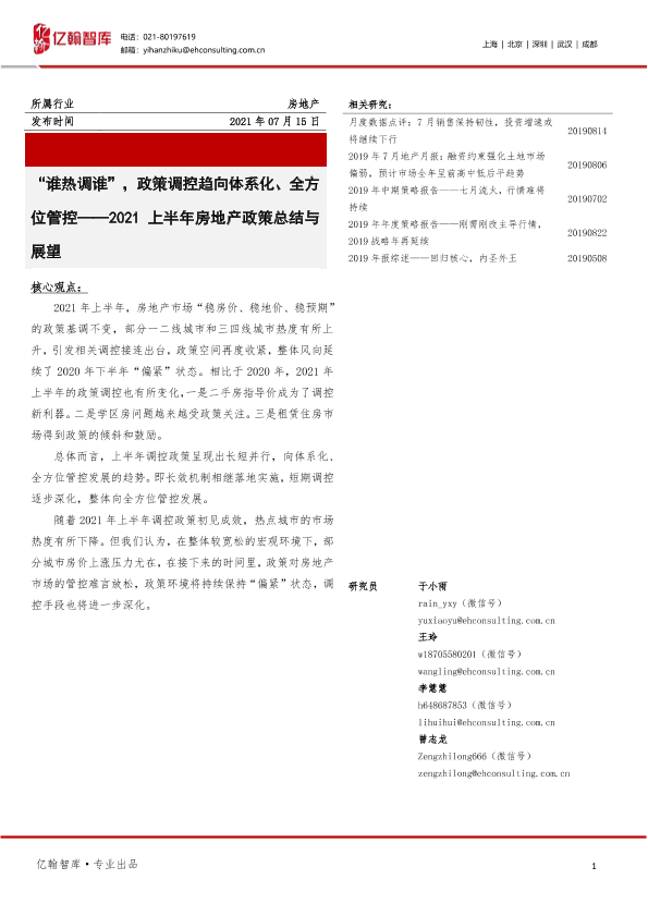 【亿翰智库】【20210715】2021上半年房地产政策总结与展望:“谁热调谁”,政策调控趋向体系化、全方位管控-10页