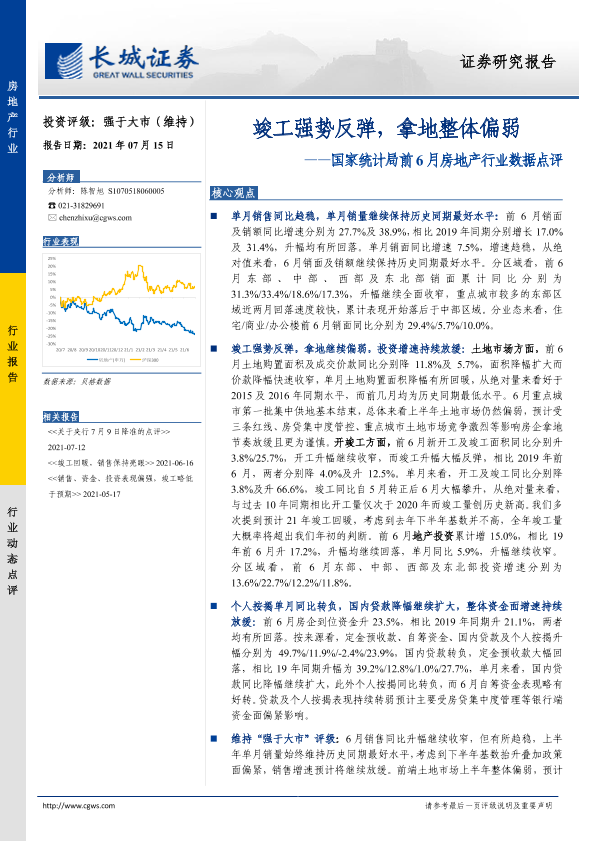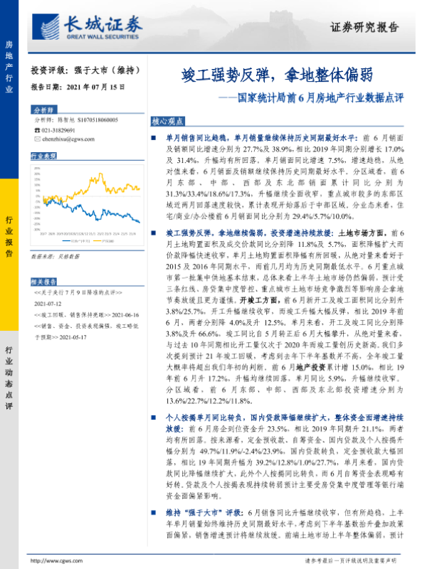 【长城证券】【20210715】国家统计局前6月房地产行业数据点评:竣工强势反弹,拿地整体偏弱-10页