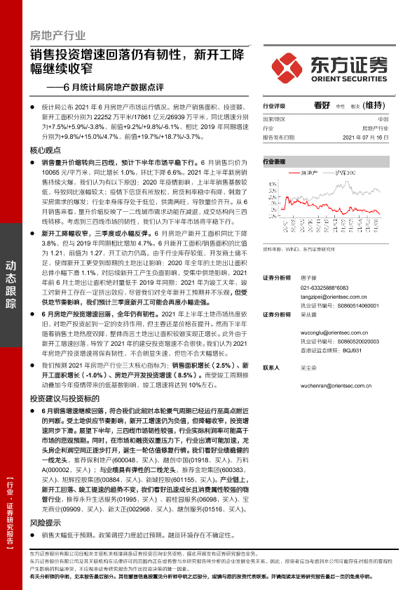 【东方证券】【20210716】6月统计局房地产数据点评:销售投资增速回落仍有韧性,新开工降幅继续收窄-10页