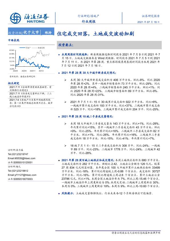 【海通证券】【20210718】房地产行业周报:住宅成交回落,土地成交波动加剧-6页