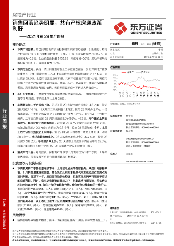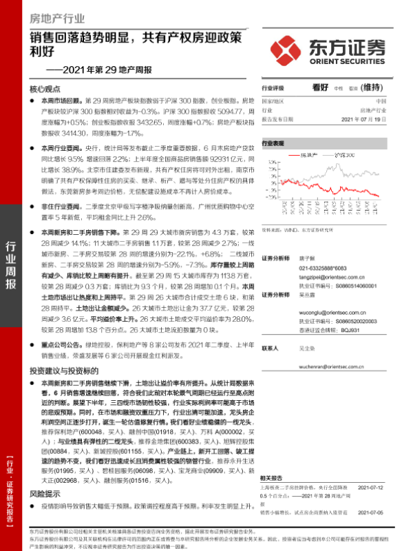 【东方证券】【20210719】房地产行业2021年第29地产周报:销售回落趋势明显,共有产权房迎政策利好-18页