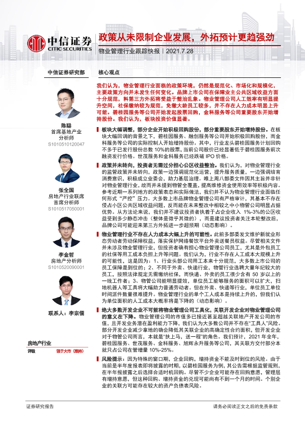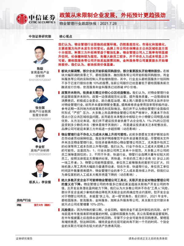 【中信证券】【20210728】物业管理行业跟踪快报:政策从未限制企业发展,外拓预计更趋强劲-3页