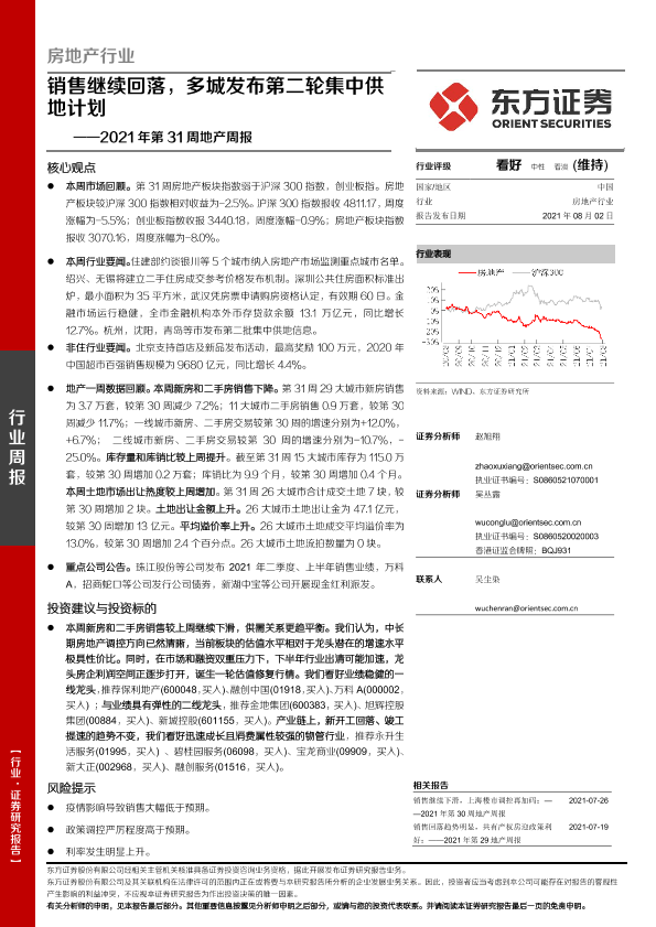 【东方证券】【20210802】房地产行业2021年第31周地产周报:销售继续回落,多城发布第二轮集中供地计划-17页