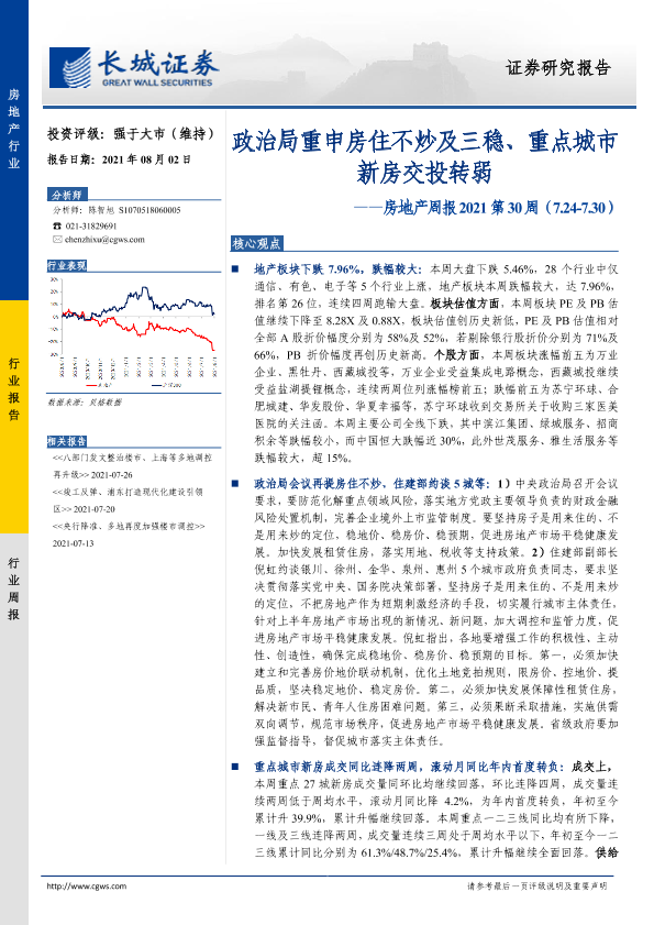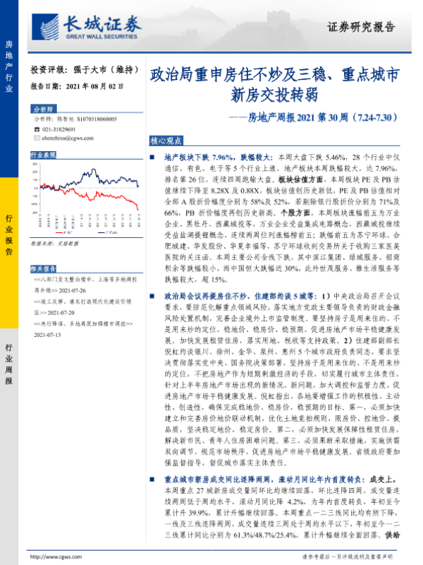 【长城证券】【20210802】房地产周报2021第30周:政治局重申房住不炒及三稳、重点城市新房交投转弱-18页