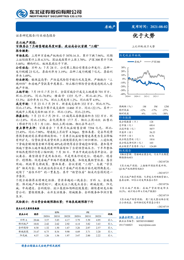 【东北证券】【20210802】东北地产周报:百强房企7月销售增速再度回落,政治局会议首提“三稳”-28页