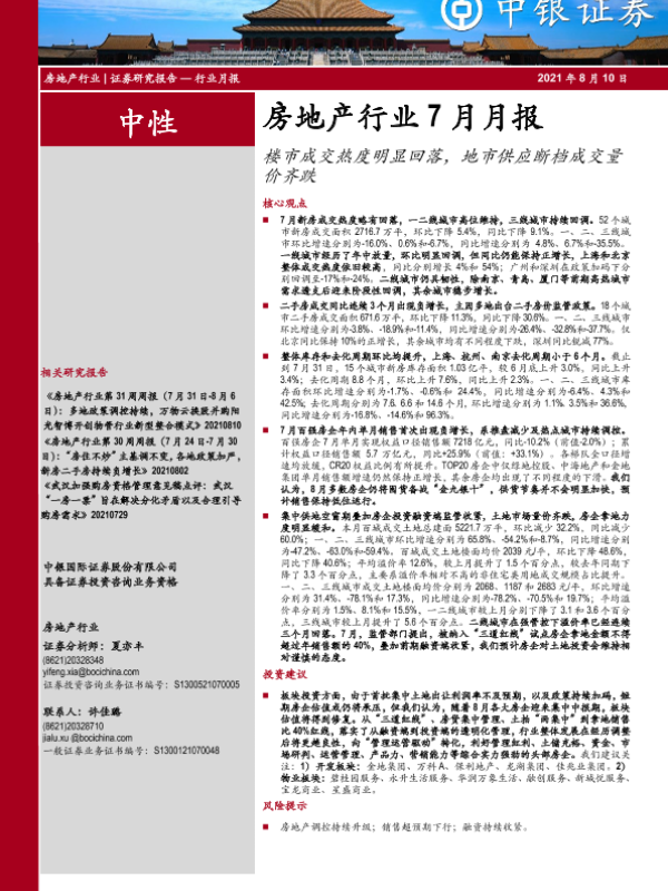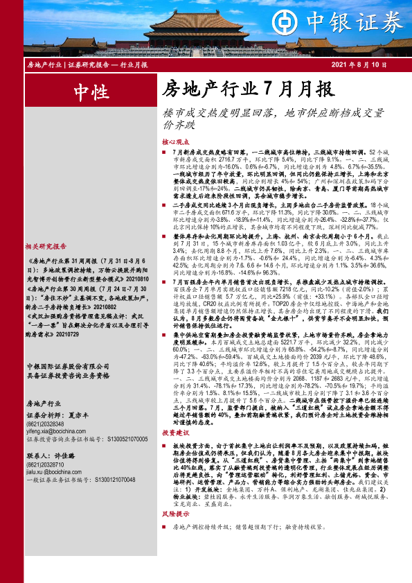 【中银证券】【20210810】房地产行业7月月报:楼市成交热度明显回落,地市供应断档成交量价齐跌-22页