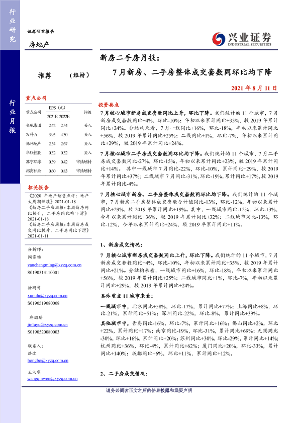 【兴业证券】【20210811】7月新房、二手房整体成交套数同环比均下降-9页