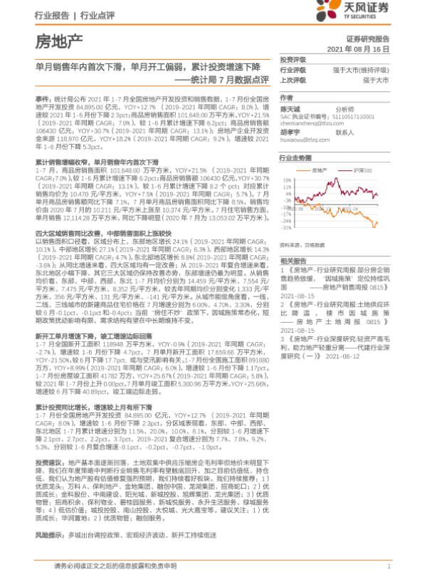【天风证券】【20210816】单月销售年内首次下滑,单月开工偏弱,累计投资增速下降-2页