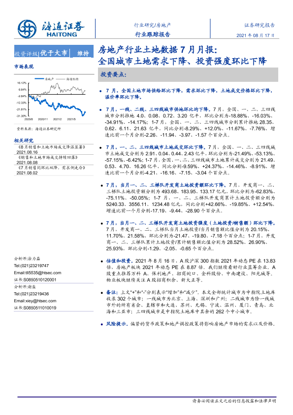 【海通证券】【20210817】房地产行业土地数据7月月报:全国城市土地需求下降、投资强度环比下降-8页