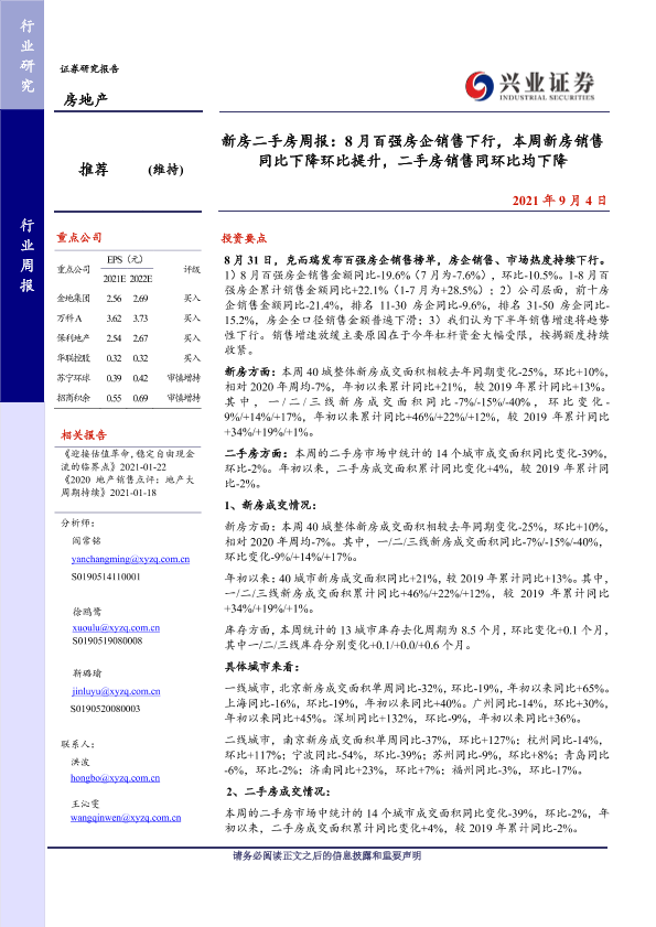 【兴业证券】【20210904】房地产新房二手房周报:8月百强房企销售下行,本周新房销售同比下降环比提升,二手房销售同环比均下降-27页
