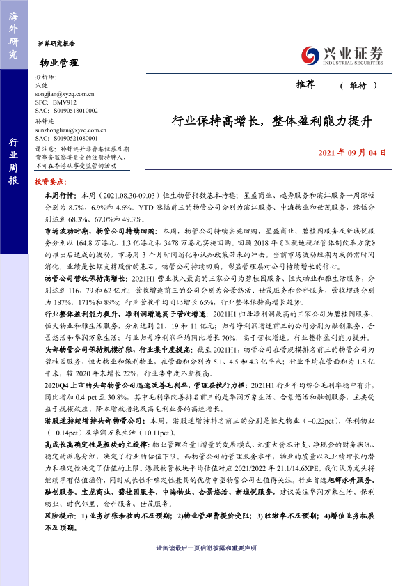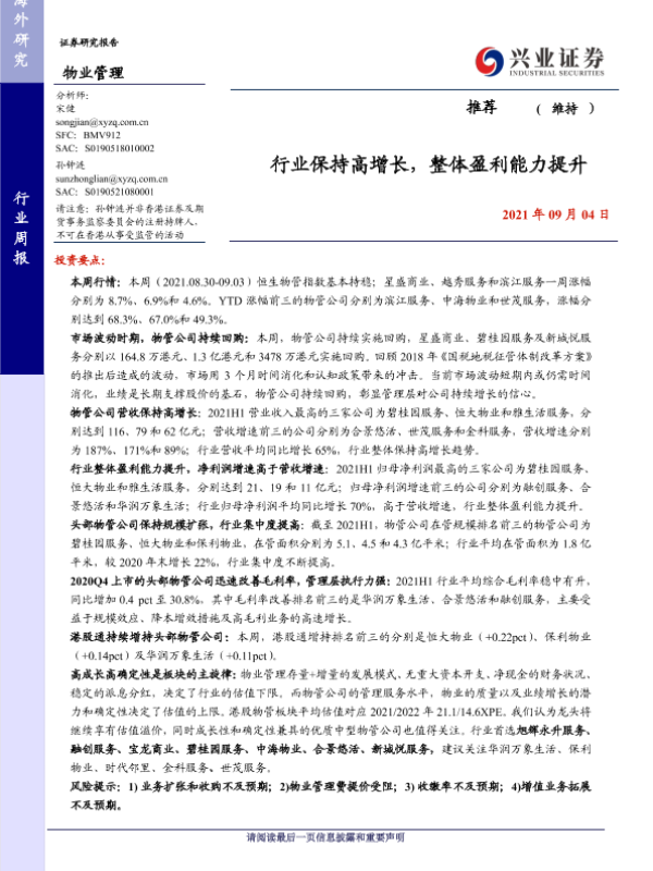 【兴业证券】【20210904】物业管理行业周报:行业保持高增长,整体盈利能力提升-11页