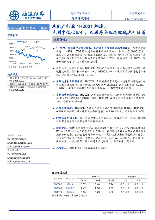 【海通证券】【20210906】房地产行业1H2021综述:毛利率低位回升,A股房企三道红线达标改善-26页