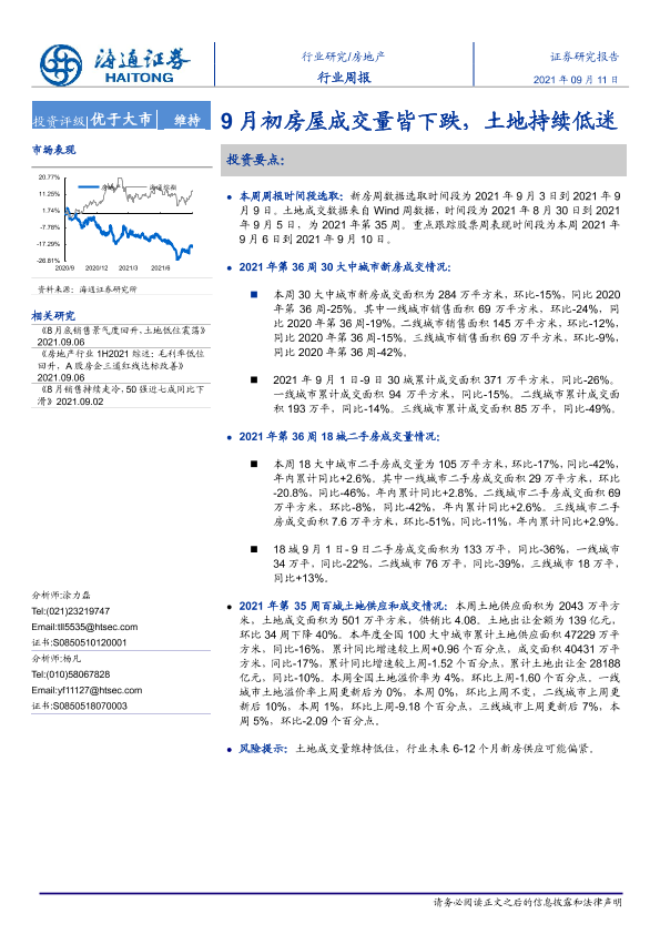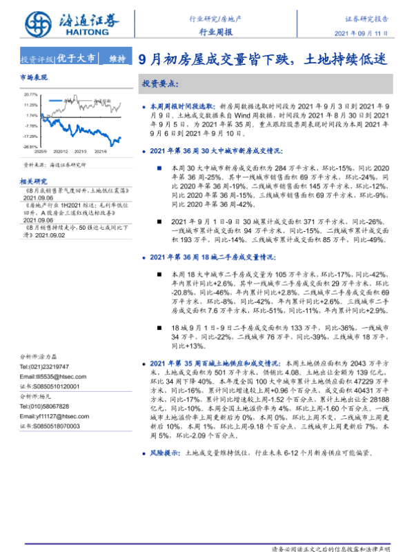 【海通证券】【20210911】9月初房屋成交量皆下跌,土地持续低迷-6页