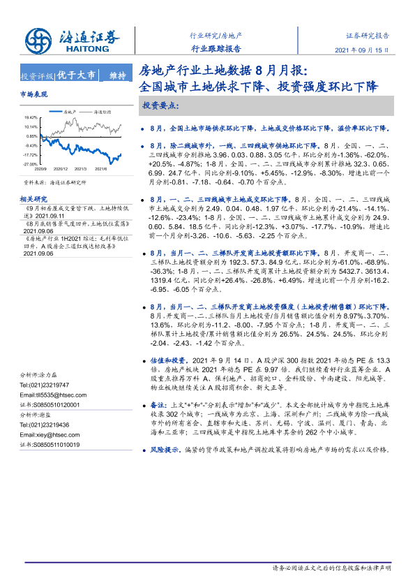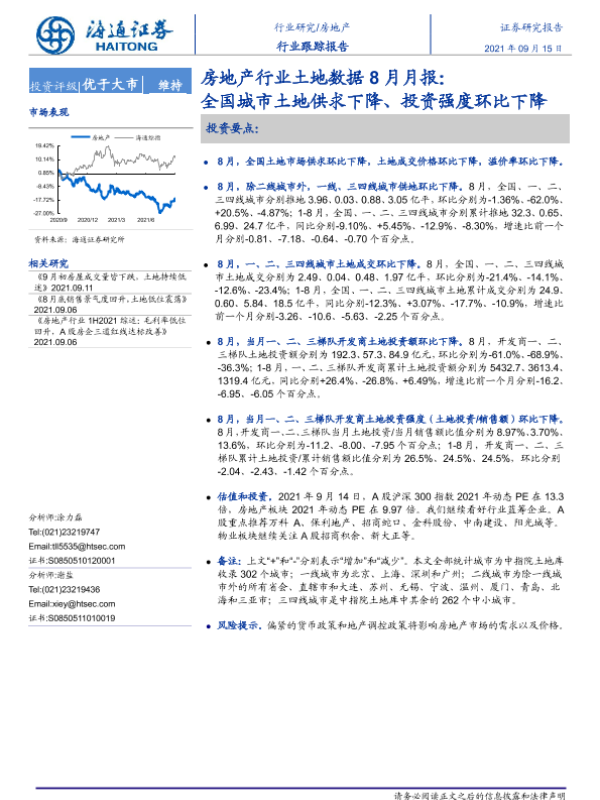 【海通证券】【20210915】房地产行业土地数据8月月报:全国城市土地供求下降、投资强度环比下降-8页