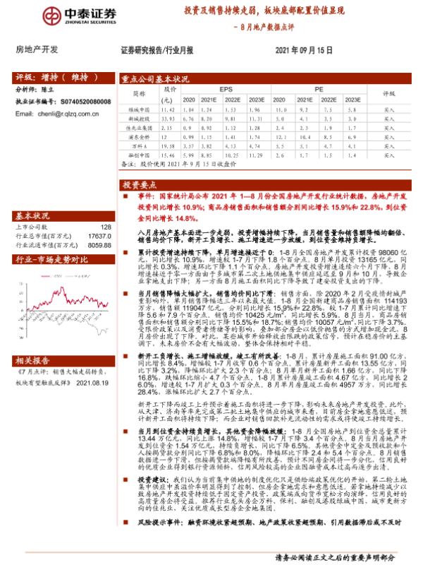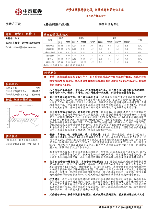 【中泰证券】【20210915】8月地产数据点评:投资及销售持续走弱,板块底部配置价值显现-5页