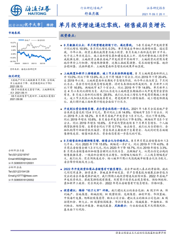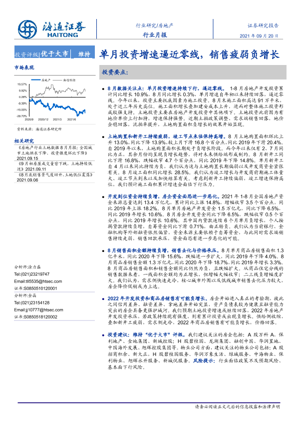 【海通证券】【20210920】房地产行业月报:单月投资增速逼近零线,销售疲弱负增长-12页