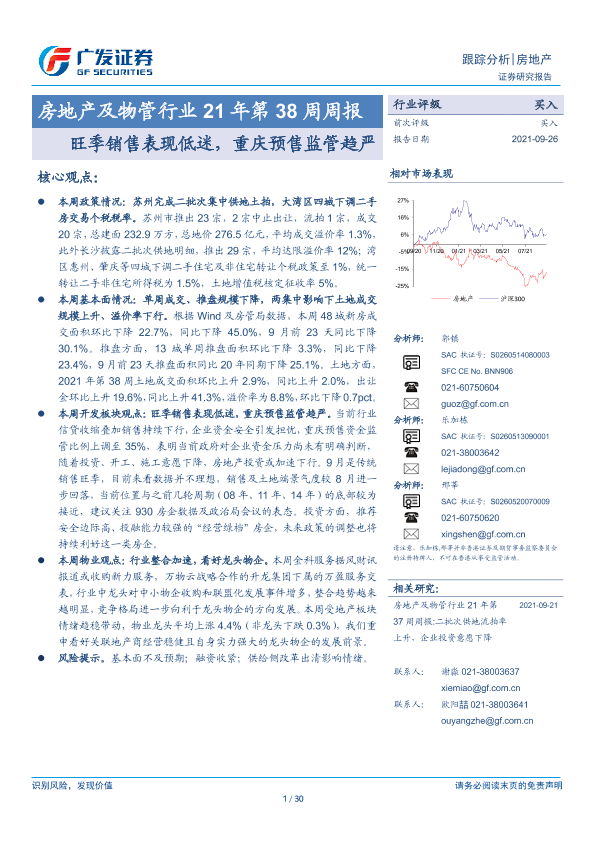 【广发证券】【20210926】房地产及物管行业21年第38周周报:旺季销售表现低迷,重庆预售监管趋严-30页